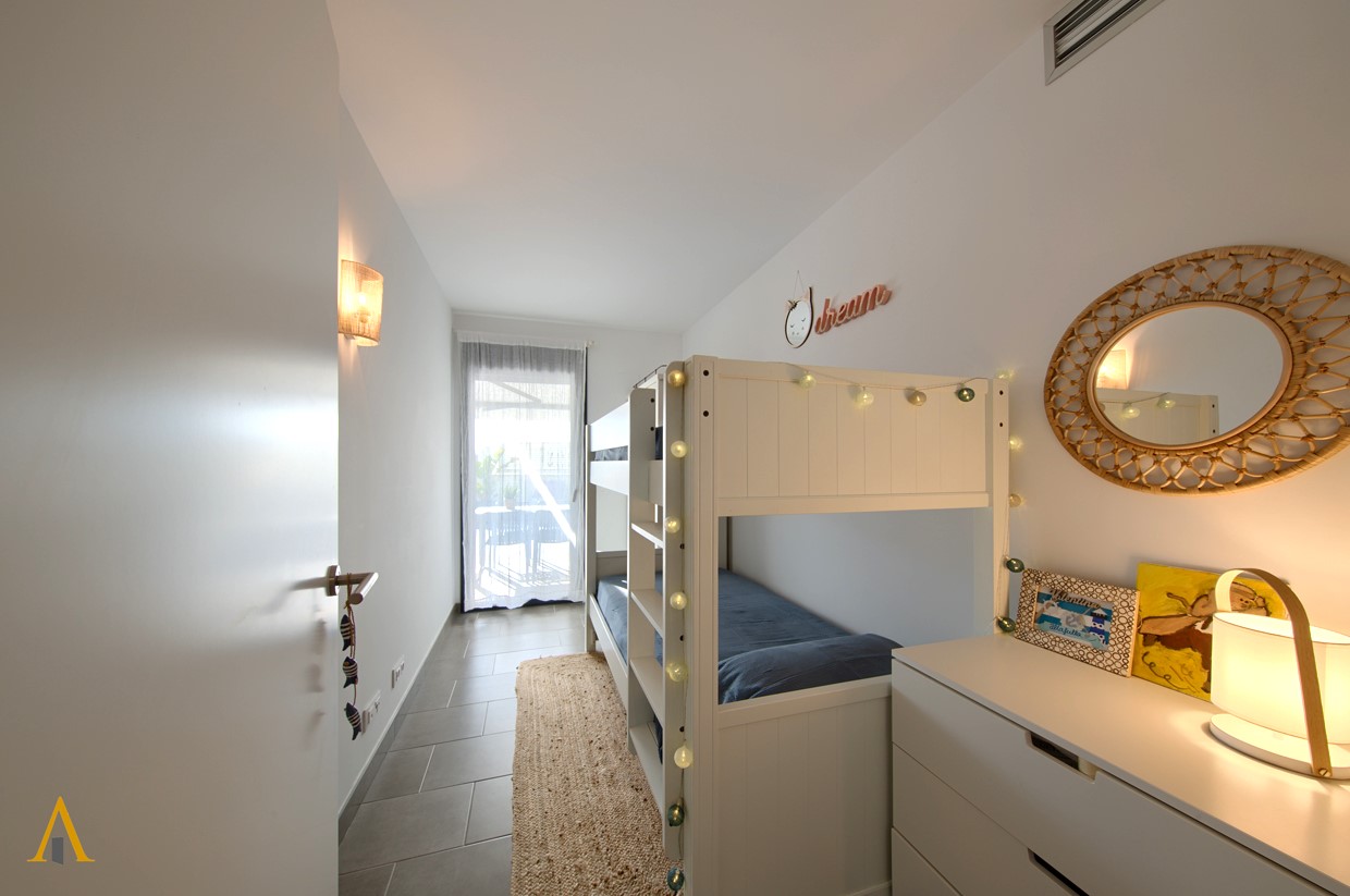 Découvrez un appartement de rêve : trois chambres spacieuses, une terrasse spectaculaire et tout le nécessaire pour vivre des vacances inoubliables. Situé au rez-de-chaussée, il dispose d’une suite élégante, d’une chambre avec lits superposés parfaite pour les enfants et d’une chambre confortable qui invite au repos.